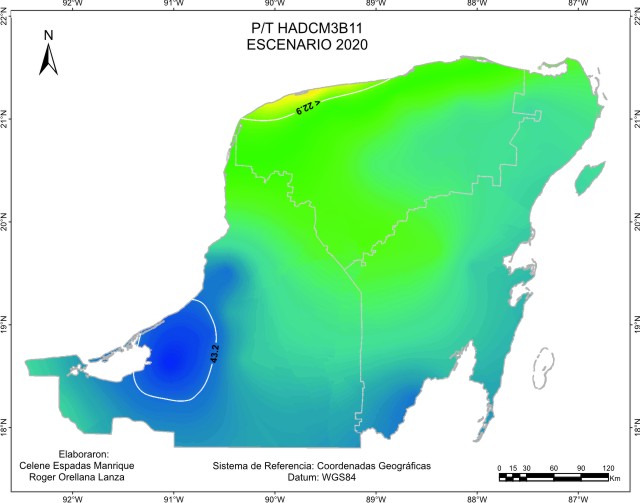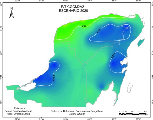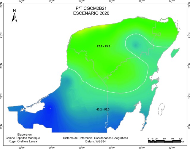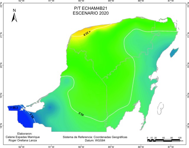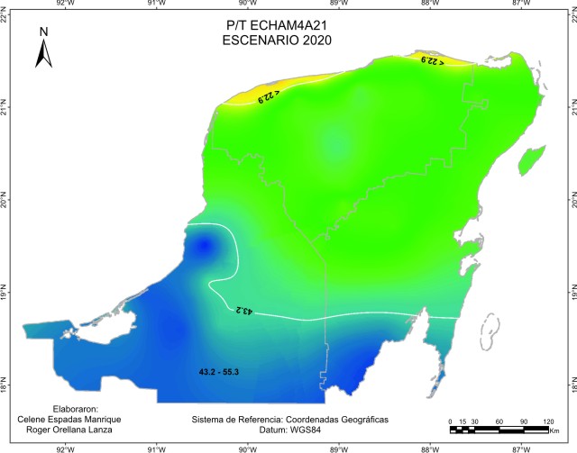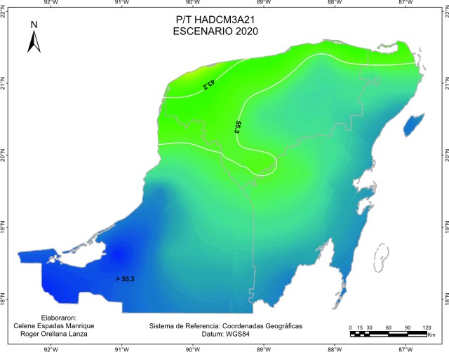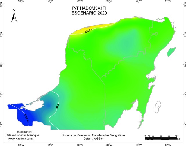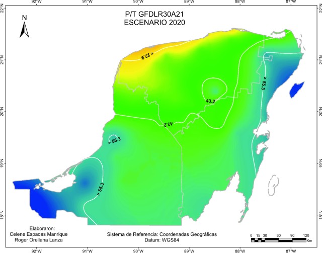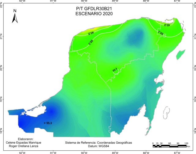 El P/T o índice de Lang es un estimador de eficiencia de la precipitación en relación con la temperatura. Éste se calcula como el cociente entre la precipitación total anual y la temperatura media anual de un lugar, o en todo caso, de una zona. Éste es considerado como un índice de humedad o aridez, según se interprete, y ha sido utilizado por muchos años. En México ha sido el fundamento inicial para las modificaciones a la clasificación climática de Köppen y adaptado a las condiciones del país, trabajo realizado por Enriqueta García en 1964 y que posteriormente se ha continuado mejorando. Esta autora agrupó los datos de sitios áridos y semiáridos del país, calculándolos por el método estadístico de las cuartilas, y obtuvo como resultado un valor límite superior de 22.9. Con el mismo método logró obtener el límite inferior que separa a los semiáridos y los áridos respecto a los subhúmedos, resultando con un valor de 43.2. Mientras tanto, el límite superior de los subhúmedos del país, en particular para la península de Yucatán, por el mismo método resultó de 55.0. De esta manera, de forma resumida se describieron los límites estadísticos teóricos entre los áridos y semiáridos con 22.9; entre los más secos de los subhúmedos con 43.2, y entre subhúmedos intermedios y los más húmedos de los subhúmedos el límite de 55.3. Debido a que los valores de estos límites estadísticos tienen una resolución excelente para apreciar la potencialidad en la disponibilidad del agua en relación con la temperatura, así como con la distribución de la vegetación, con la distribución de algunas especies vegetales indicadoras y con la potencialidad para establecer ciertos cultivos, se describen los posibles escenarios dados por los contrastes de las salidas de las diferentes familias de los modelos de circulación general de la atmósfera para la península de Yucatán.