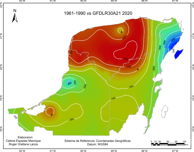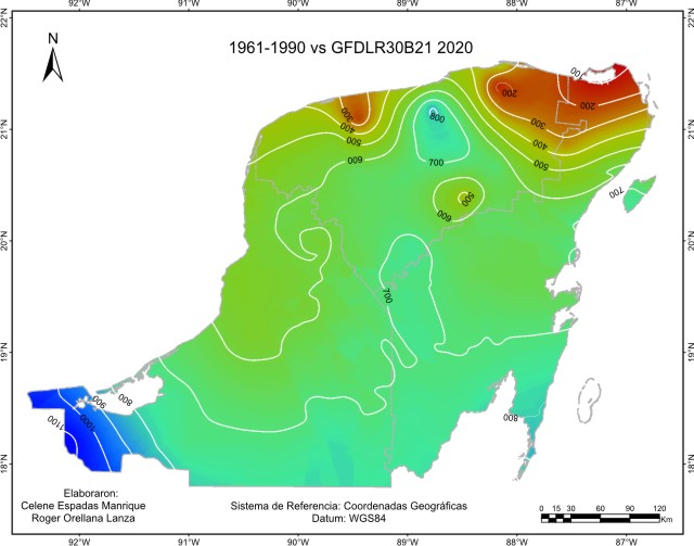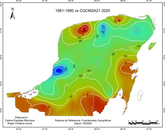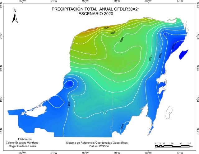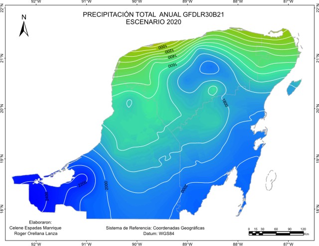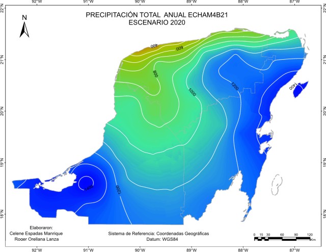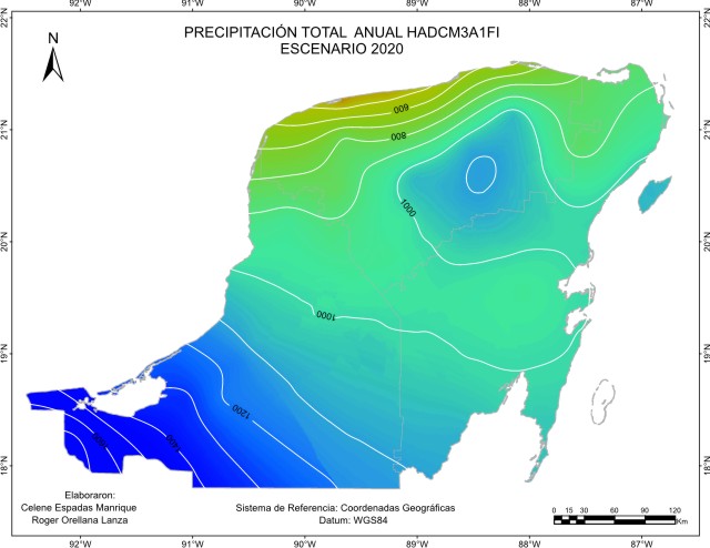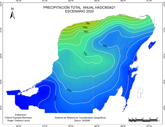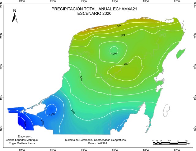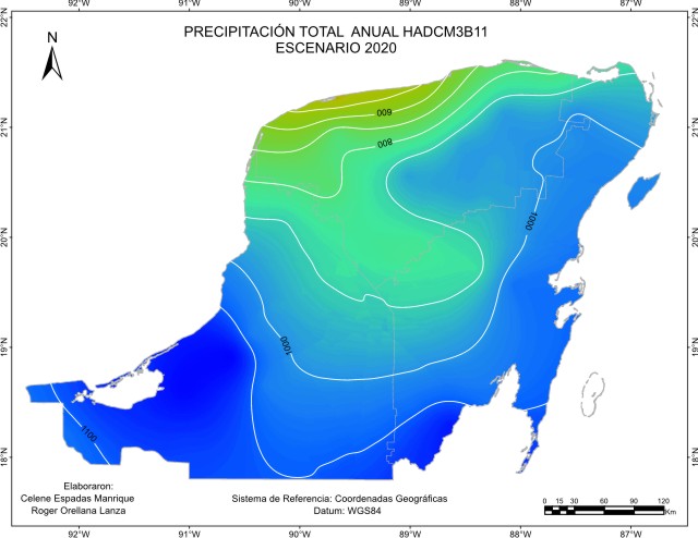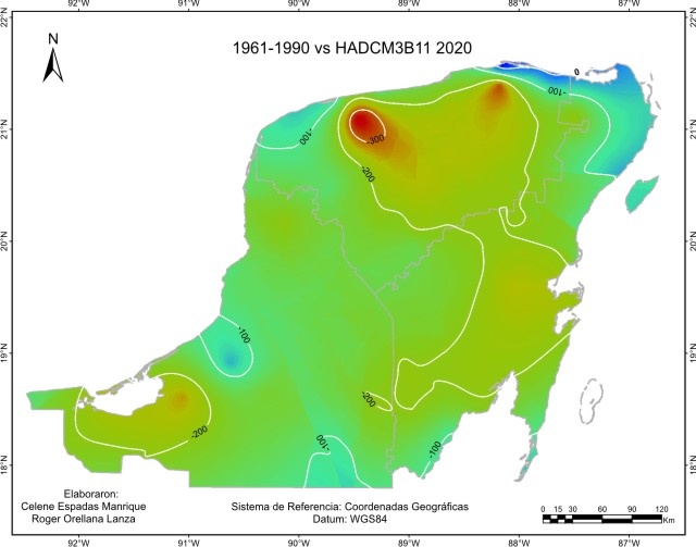 De acuerdo con el método sugerido por el IPCC, los escenarios base o de referencia para considerar la cantidad de precipitación pluvial o lluvia anual “normal”, abarcan el periodo 1961-1990 y es el que está representado en este escenario base. Este mapa de isoyetas nos muestra que está presente en la región un gradiente de precipitación desde una zona seca menor a 600 mm de lluvia en el Noroeste, a una húmeda en el Sur, sobre todo en el Suroeste con más de 1400 mm en las inmediaciones de Laguna de Términos y limitando con la llanura costera del Golfo. La mayor proporción de superficie recibe entre 1000 y 1200 mm.